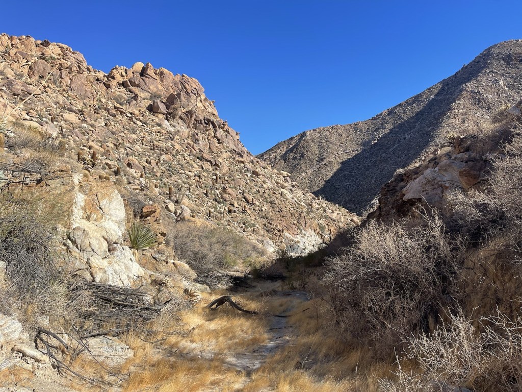 The terrain was friendlier on this ridge than the descent from Groan. I could see more palm trees in the canyon below.
