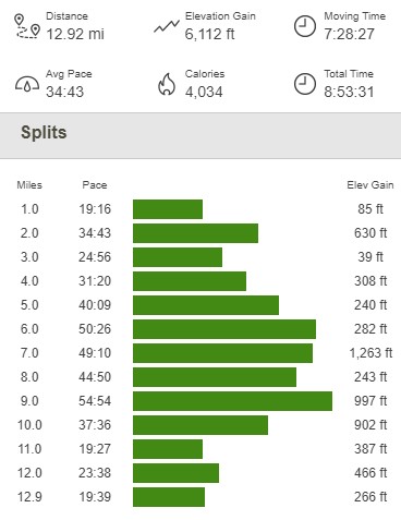 I turned left onto another road, hiked south across Redondo Flat, and then turned left again. I finally reached the car once more at 3:44pm. This hike totaled 12.92 miles, 6112 feet elevation gain, and 8:53:31 total time.