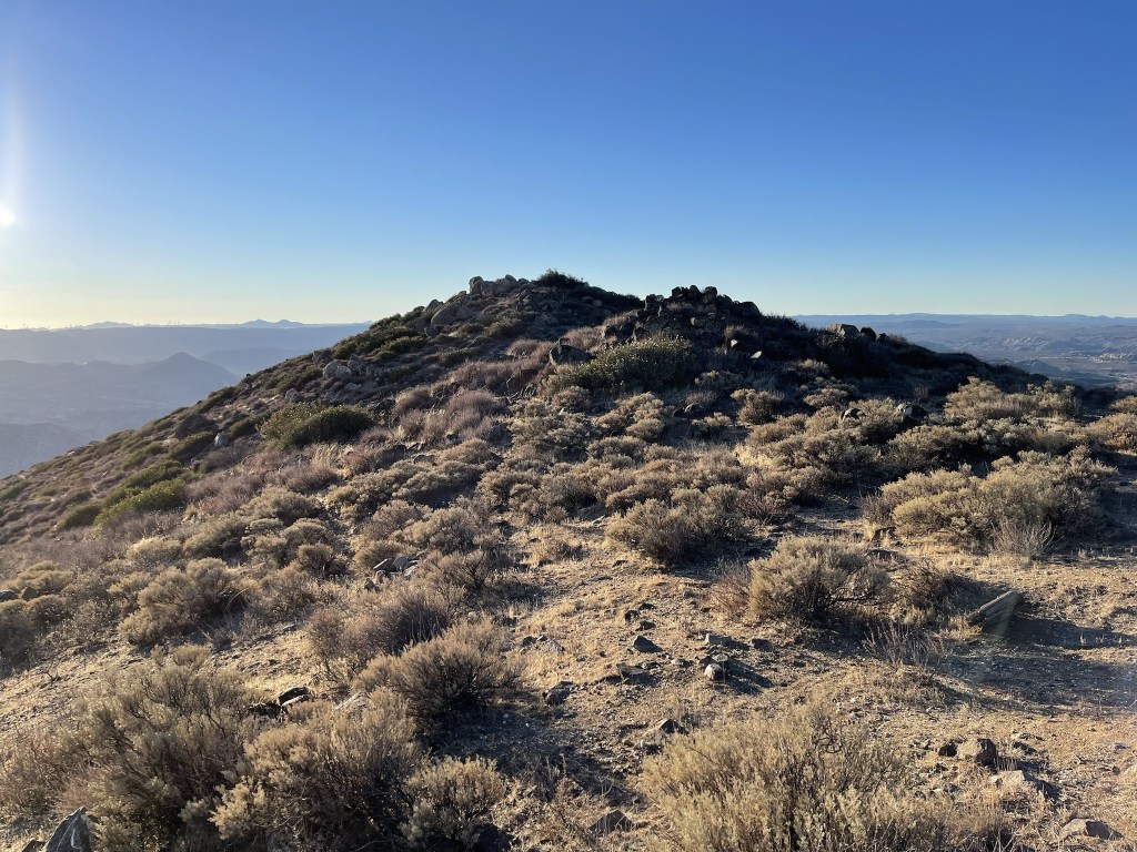 I reached Gasp Benchmark at 11:30am at 6.7 miles! Similar to Groan, Gasp Benchmark is located on a random pile of rocks instead of a highpoint along the ridge. I was pretty excited to have climbed my 96th and 97th peaks on the San Diego 100 Peaks List. Only 3 more to go! I signed the register which dated back to 1995. The previous entry was from November 11. I did not locate the benchmark or any reference markers. I had a good view of Tule (right) and Rozzie (left) to the south: