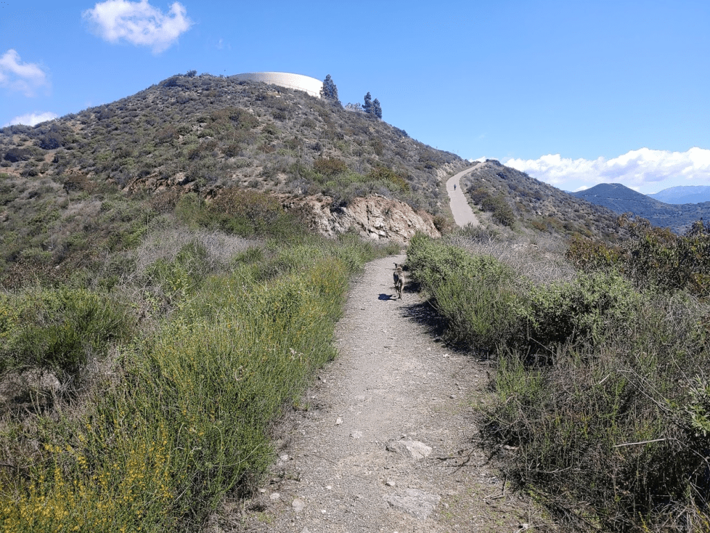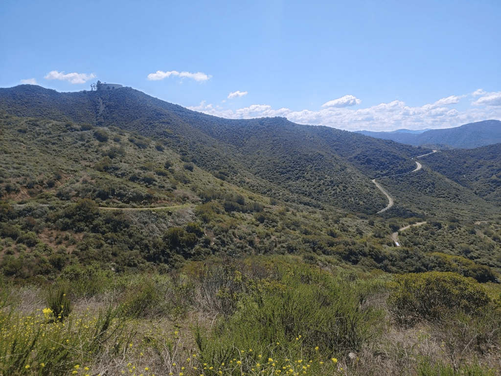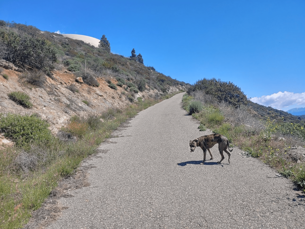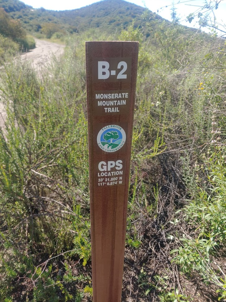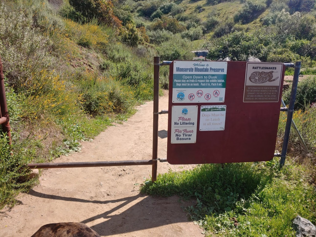 It was the last Friday of March and I had the day off, so naturally I decided to go for a hike. I originally was supposed to be off on Thursday for San Diego Padres opening day, but with no sports for the foreseeable future, I decided to switch my day off to Friday to make it a long weekend. I was planning on doing a 2 day trip out to Anza Borrego, but then an unusually cold winter storm came through Thursday night and dumped snow on all the higher elevation parts of the county. I checked the Cal Trans website in the morning, and it appeared all of the highways over the mountains were closed or had chain controls. There didn’t seem to be any safe way to get to the desert (every route from SD to Anza Borrego requires going over the mountains). My next plan was to head back to the Santa Ana Mountains, where I had just been the week before with Stella to climb Sugarloaf and Old Sugarloaf. The Santa Anas are relatively low, and I didn’t think snow would be an issue. I settled on climbing 4604 foot Trabuco Peak, and I had Stella along with me once more. Leaving around 8am, we made it pretty close to the trailhead just after 10, only to find the whole area gated off. This entire section of the mountain range was closed to all use as it recovers from the 2018 Holy Fire. I was pretty frustrated at this point. I had my first day off in months and all my plans were being thwarted. I changed plans once again and decided to climb 1567 foot Monserate Mountain, an insignificant little peak just east of the 15 in Fallbrook. This would be a rather short and easy hike, but at least it would be on the way back home (so no extra driving). We arrived at the large parking area around 11, where there were already about 20 cars parked. I nearly got coronavirus just thinking about how crowded the trail would be. We finally got started at 11:10am from about 361 feet.