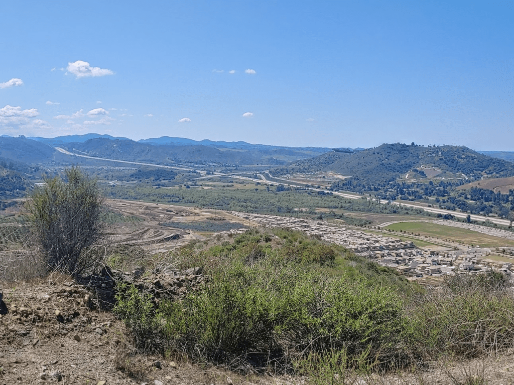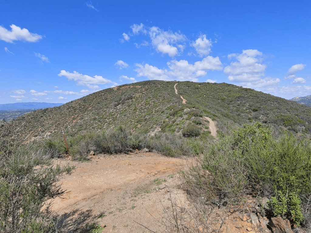 At 1.43 miles we followed a little spur trail to a minor peak. This peak isn’t on Peakbagger so I’m not sure its exact elevation, but my phone showed us to be at 870 feet. We had a nice view of Fallbrook and I-15 heading south.