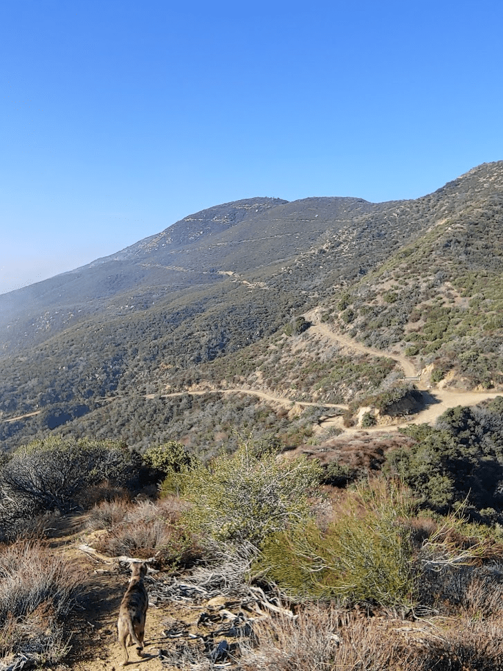 At 4:45am Stella and I were on the road and driving north towards the San Bernardino mountains. I was excited to return to the large mountain range which lies northeast of the Inland Empire. I had only been hiking in the San Bernardinos twice, back in June 2018 to climb 11,503 foot San Gorgonio Mountain and in October 2018 to climb 10,649 foot San Bernardino Peak. San Gorgonio is the highest mountain in all of southern California and the 2 peaks are undoubtably the most well known peaks in the range. Since the mountains had already received a decent amount of snowfall this year at higher elevations, my goal today would be a few lower peaks. I had a few ideas of peaks to climb throughout the week, but I finally settled on Keller, Slide and Mill Peaks the night before. Keller and Slide are both well over 7000 feet so I was concerned there would be too much snow, but I thought I would drive up there and take a look. I started up State Route 130 and reached the little mountain town of Running Springs. There were some huge snowbanks throughout town which reminded me of back home in the Midwest. I noticed most of the mountainsides were covered in snow and it looked like most of the dirt roads required to get to the trailhead were closed, so I decided to drive back down to lower elevations. My next idea was to drive back down CA-130 where I could climb Harrison Mountain and McKinley Mountain. Both would require hikes of about 4-5 miles so I thought I could make a good day out of climbing these 2 lower peaks. I reached the dirt turnout where the route for Harrison begins and finally got out of the car and began hiking at 7am.