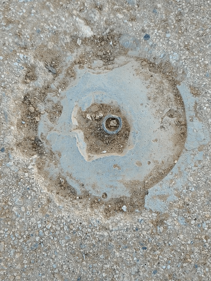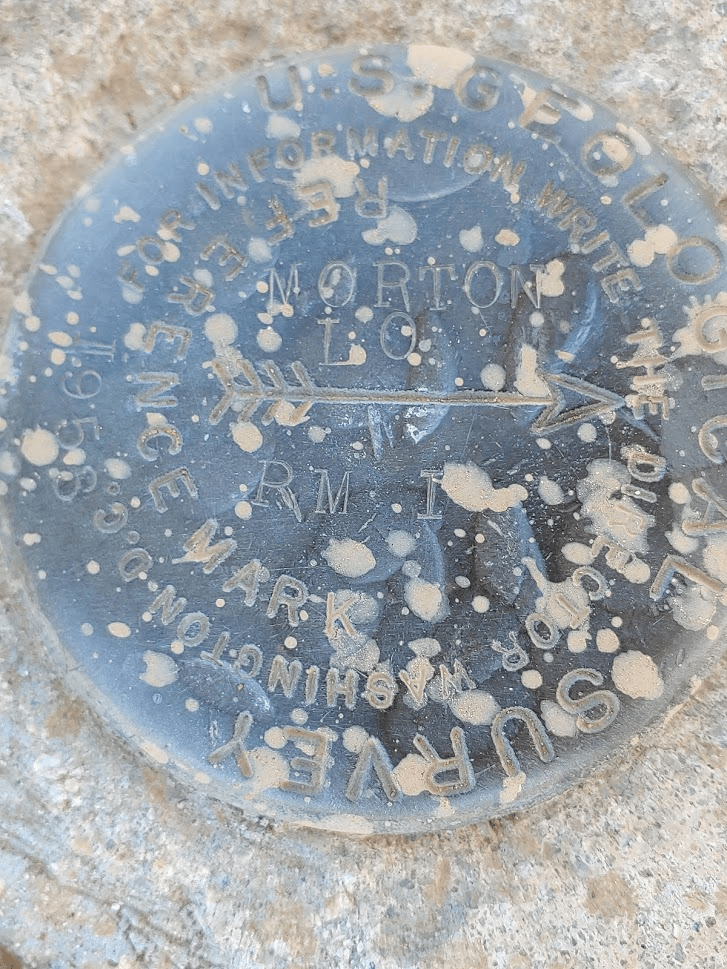 The USGS triangulation benchmark was missing, but we found where it used to be on the concrete foundation directly beneath the tower.