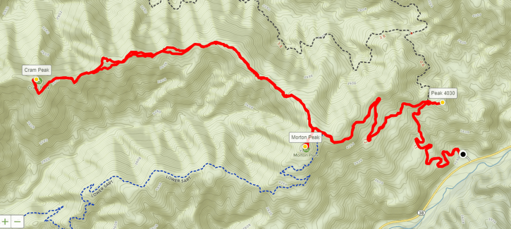 We reached the car around 8:20am. I clocked 2.2 miles, 801 feet elevation gain, and 1:18:43 total time on our attempt on Harrison. I was disappointed at the lost time and wasted miles, but it was still early, and I had a lot of energy left. I made the decision to try for 2 more peaks called Morton Peak and Cram Peak, which can be climbed together in about a 10 mile hike. It was about a 30 minute drive to the trailhead just off State Route 38. I parked at the small dirt turnout where Forest Road 1N12 begins. There were 5 mountain bikers getting ready to ride up the road when I arrived. One could drive up this road to a gate where the road to Morton Peak begins. This would save about 2.5 miles round trip, but I decided to begin hiking here.