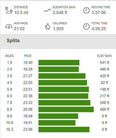 Total stats for the hike were 10.3 miles, 2648 feet elevation gain, and 4:26:25 total time.