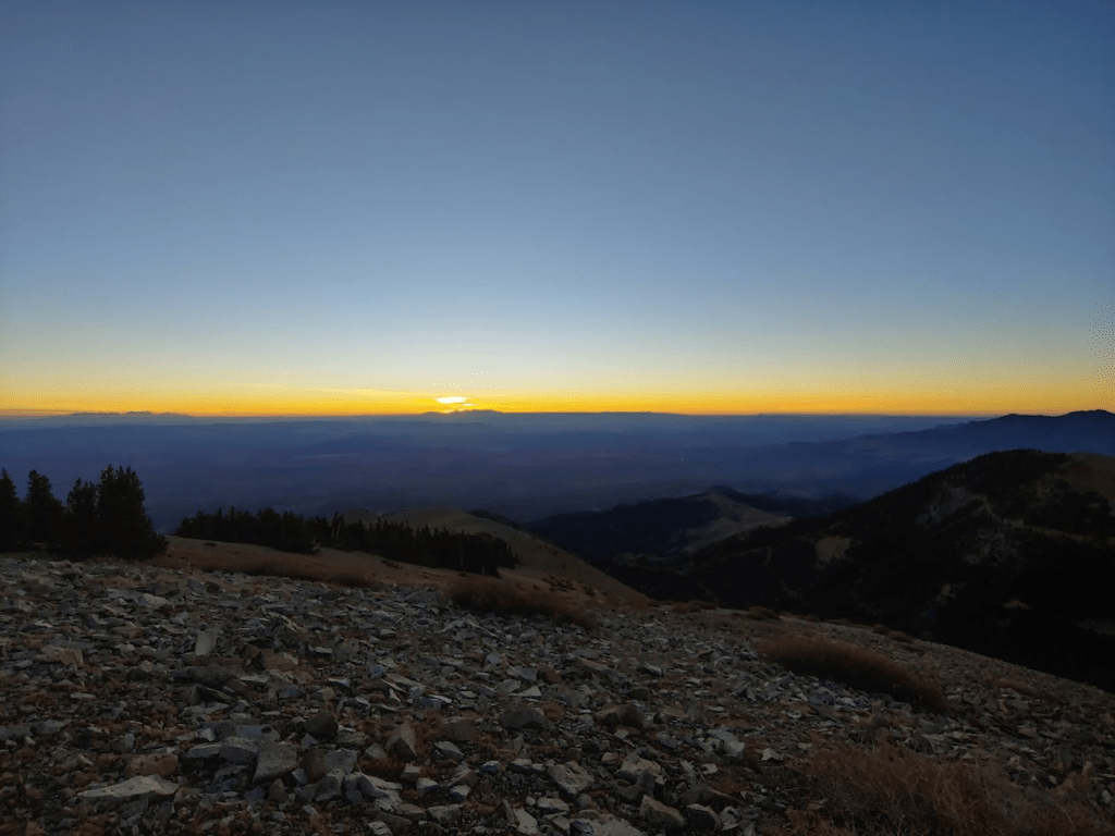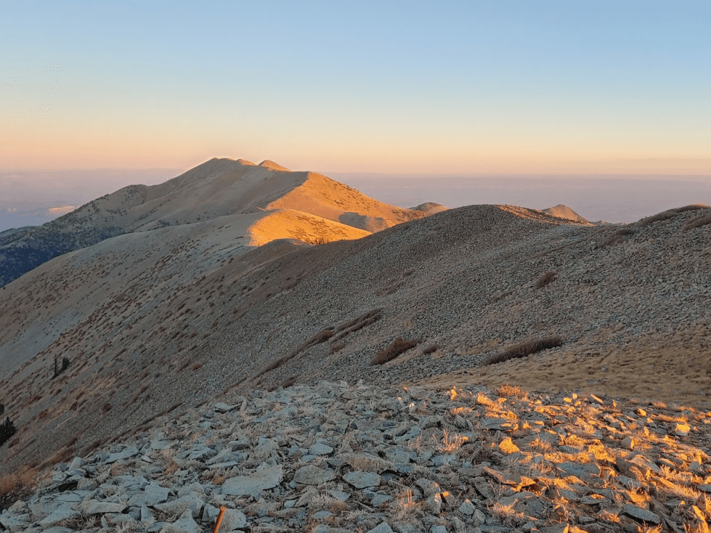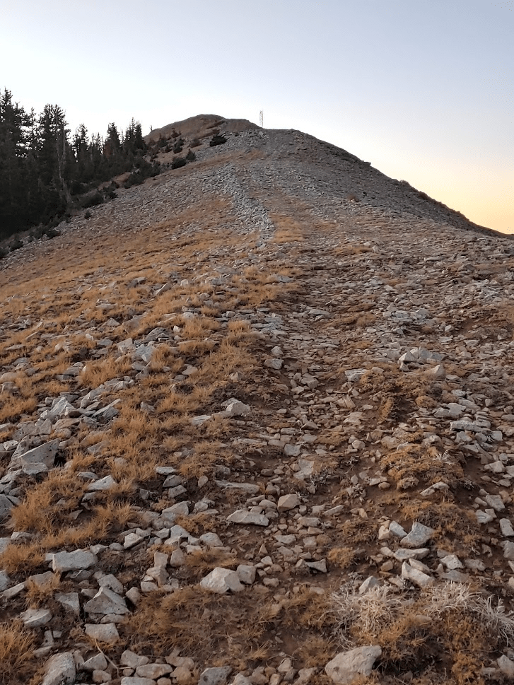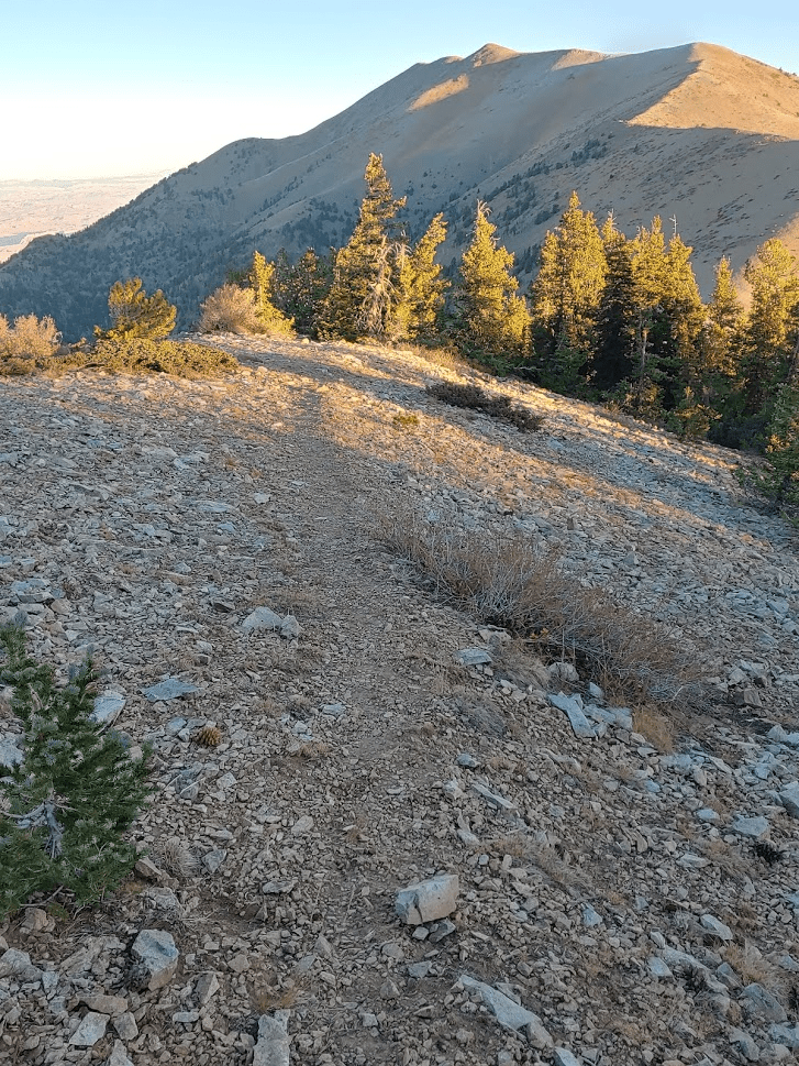 I began hiking at 6:52am. Mount Ellen is about 2 miles north of Bull Creek Pass, but first, I decided to climb its slightly lower south summit (11,419 feet). The south summit is only a mile from the pass so I figured I could get up there by sunrise. I initially made a steep ascent through some pine trees. After a short while I came out into the open on the ridge leading to the south summit.