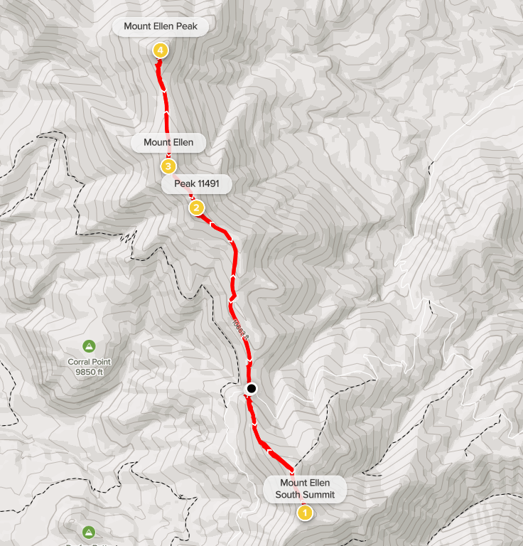I had one more peak to do before turning around, called Mount Ellen Peak (11506 feet). This peak is about a mile north of Mount Ellen itself and only 16 feet lower. It does have 386 feet of prominence so would require some descent/ascent between the peaks. The summit is almost perfectly conical which makes it an attractive peak from a distance.