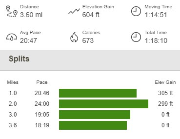 I reached the car at 7:39am. This hike totaled 3.6 miles, 604 feet elevation gain, and 1:18:10 total time.
