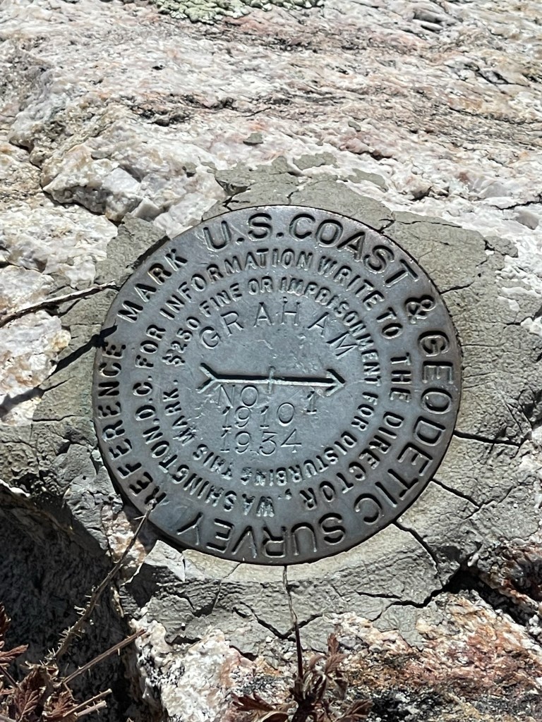 The peak was a short climb from the road. I reached the summit at 11:19am at 7.4 miles. The views were decent. This is looking back at Graham:
