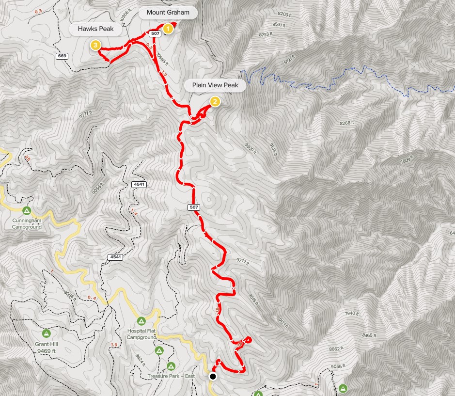 Mount Graham is the highest mountain in southern Arizona at 10720 feet. With 6320 feet of prominence, it is the most prominent peak in the state of Arizona and 20th overall in the contiguous United States. My plan was to climb Mount Graham as well as 2 other nearby peaks over 10000 feet – Webb Peak (10030 ft) and Heliograph Peak (10022 ft). I had driven up Highway 366 as far as Arcadia Campground the night before. I woke up early and made the drive to Webb Peak. The highway is paved to Shannon Campground and then the final 7 miles are well graded dirt. I parked on the side of the road and began hiking at 6:21am from 9420 feet.