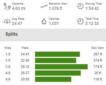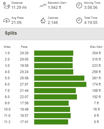 I reached the car at 12:38pm. This hike totaled 11.29 miles, 1942 feet elevation gain, and 4:19:05 total time.