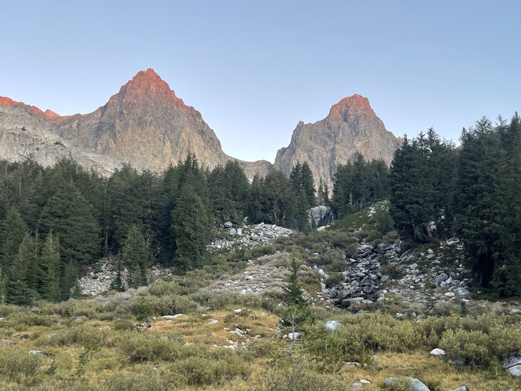 The Minarets are a small sub-range in the Sierra southeast of Mount Ritter. At 12264 feet, Clyde Minaret is the highest of the series of rugged peaks. My plan was to climb it by its class 4 rock route and then descend and hike out to the trailhead. I began hiking at 5:35am from 10256 feet above sea level. I hiked for about 30 minutes via headlamp before the sun came up.