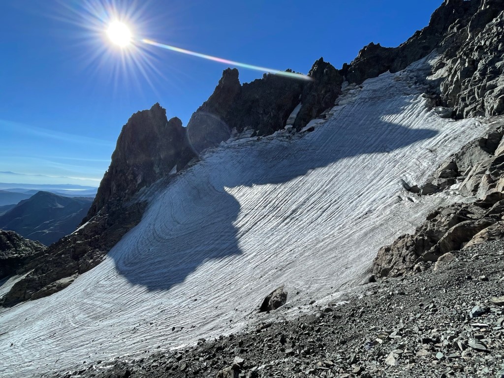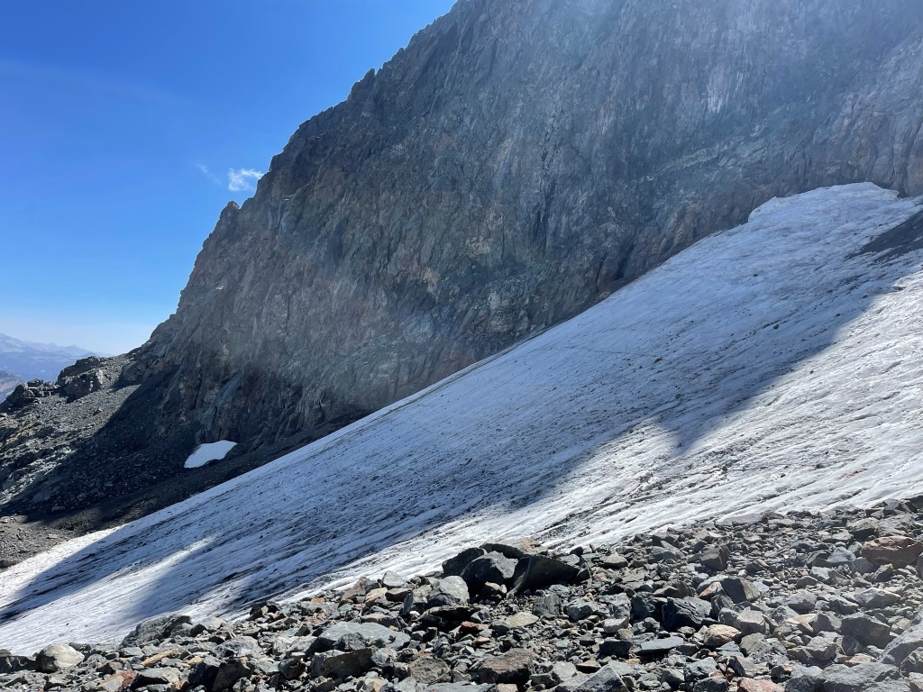 Below the chute, I skirted around a large snowfield and then descended talus slopes to the east.