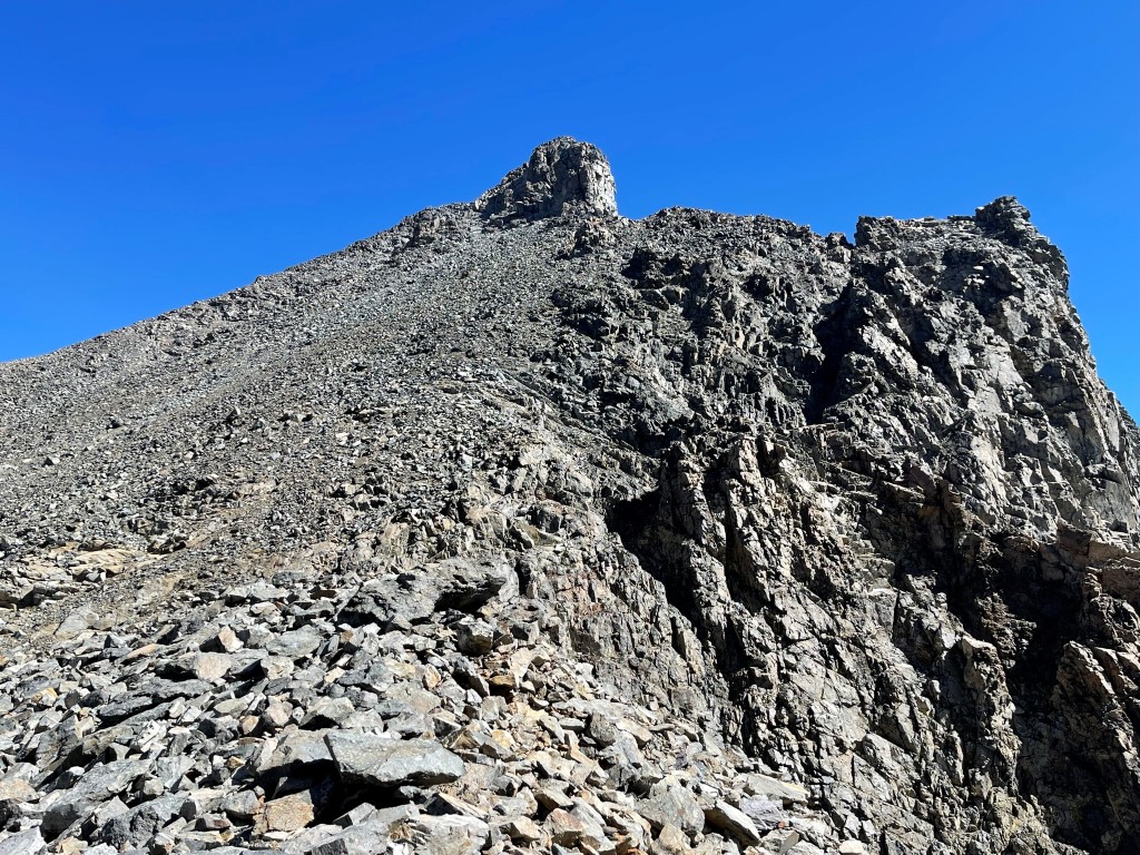 The chute was very loose, and I had to downclimb at least one class 3 move. I then traversed into another chute that descended to the northeast. This chute was wider and more solid. Eventually I reached the saddle at around 12000 feet. Banner was right ahead of me about 900 feet above.