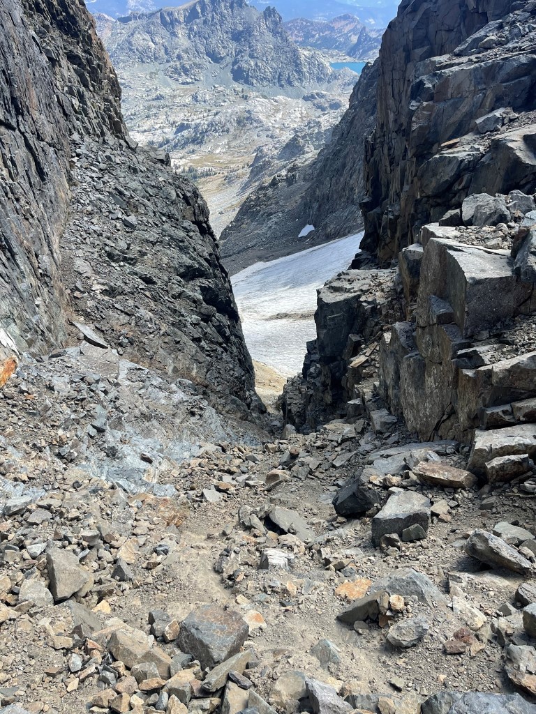 I began descending to the Ritter/Banner saddle after a 20 minute break. I hiked a short way to the east and then climbed down a steep chute to the northwest.