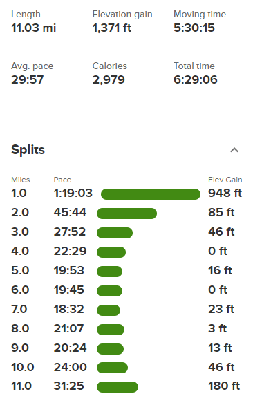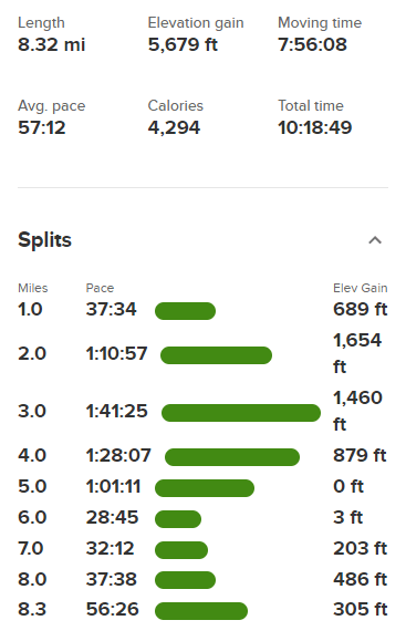 Once I was done with that, I returned to the trailhead and reached my car at noon. Stats for day 3 were 11.03 miles, 1371 feet elevation gain, and 6:29:06 total time.