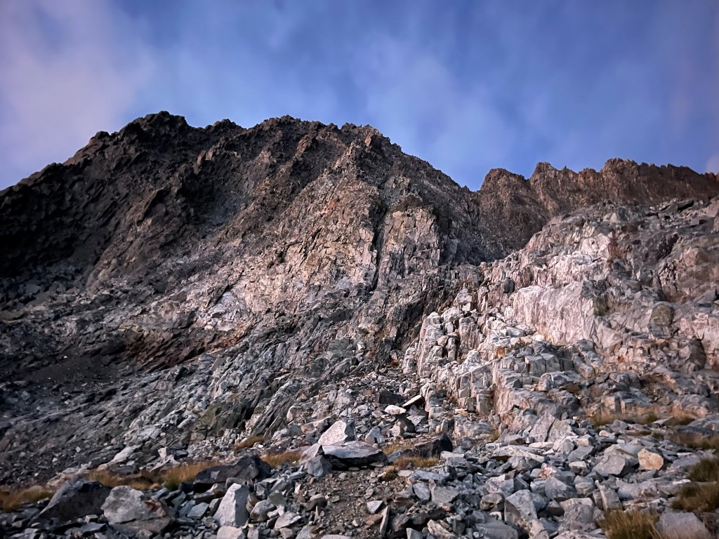 I made it to about 11100 feet before deciding to turn around. The route was supposed to be class 3 up until the summit block, but I was unable to find the correct route. I probably spent about 45 minutes looking for a way before giving up.