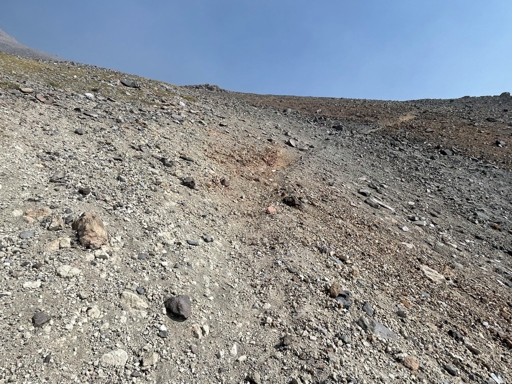 According to the map, the trail splits into 2-3 different braids around this point. I didn’t really notice any forks in the trail but based on my GPS track it appears I took the western braid. The eastern braid looks like it contains switchbacks which might make the ascent a little easier. Indeed, the trail became so steep around 11000 feet that it really slowed my progress. The mountain was so sandy and gravelly that I was taking 2 steps forward, 1 step back.