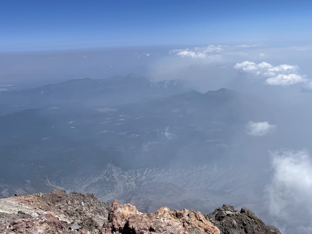 It was cold and windy on the summit. The forecast had called for a high of 35 and 40+ mph winds on the summit today. It was cold, but it definitely didn’t seem that bad. It felt warmer than it had on South Sister and Mount Bachelor earlier in the week. I had even packed my heaviest jacket in anticipation of extreme cold but never ended up using it. There was another couple who had summited just before me, so we were able to take pictures of each other. There was a very nice register on the summit. It was placed on June 6, 2021 by a climbing ranger. The ranger had left a note that they took the previous register to a library at the University of California-Berkeley. Pretty cool!