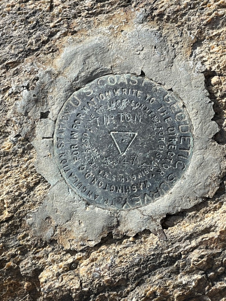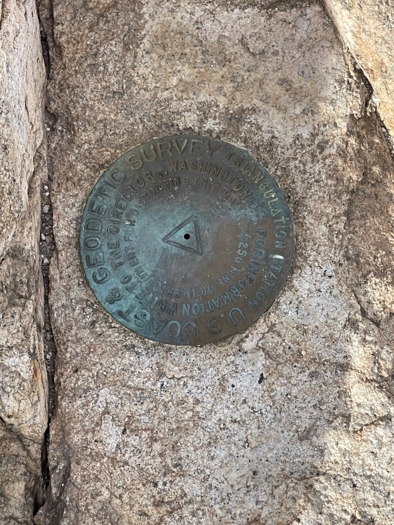 We had to make one easy class 3 downclimb just before the summit. We reached the top at 3pm at 1.92 miles! It was a little breezy on top, so I put my fleece on. We were surprised to not find a register. I did locate the benchmark and 2 reference markers.