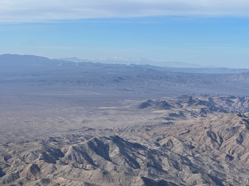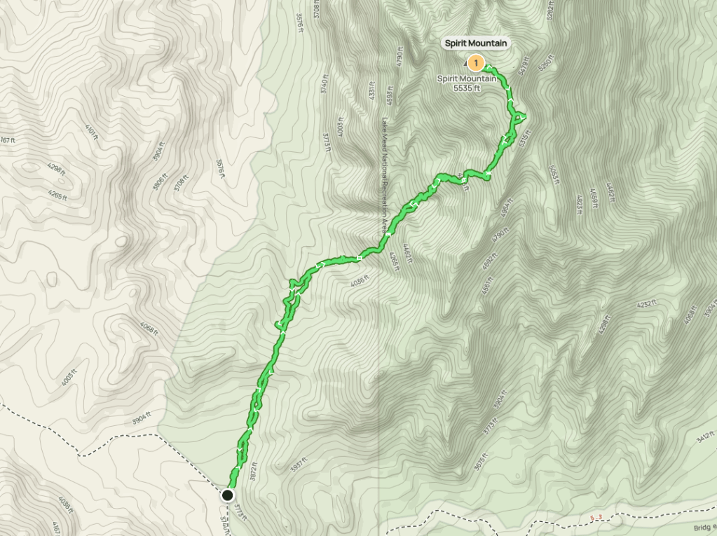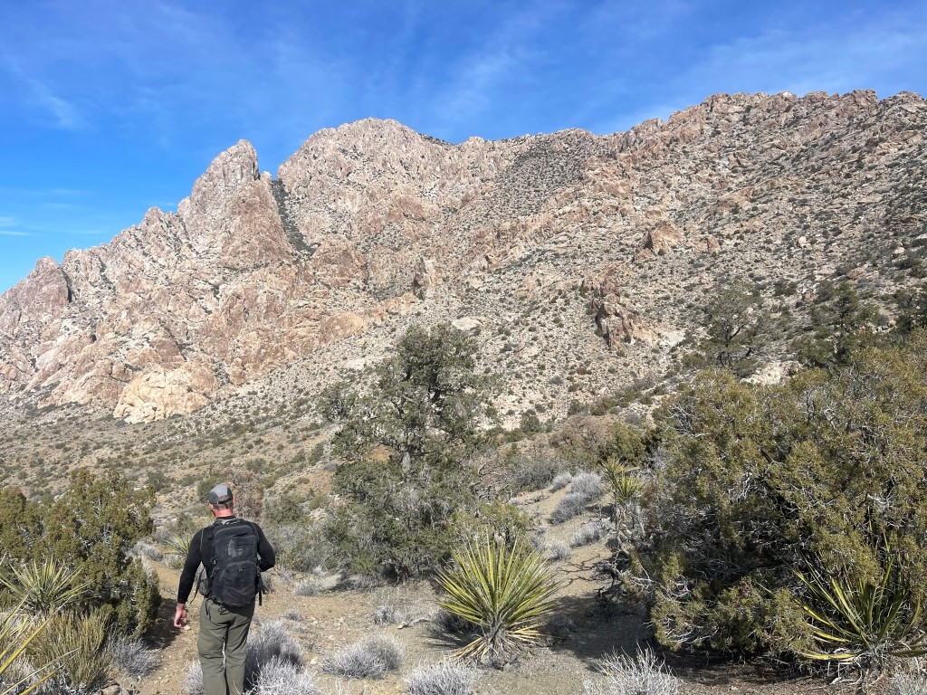 Spirit Mountain is a 5639 foot peak located in Southern Nevada northwest of Laughlin. It took about an hour and a half to drive there from Tipton. From US-95, it is about 6 miles east on Christmas Tree Pass Road to the trailhead. This dirt road is excellent and should be suitable for most cars. Garret also discovered that Christmas Tree Pass Road can also be accessed from State Highway 163 if coming from the east. This would have saved 20 minutes or so, but it ended up not mattering since we had plenty of time. We began hiking at 1:29pm from 3749 feet above sea level. It was 58 degrees.