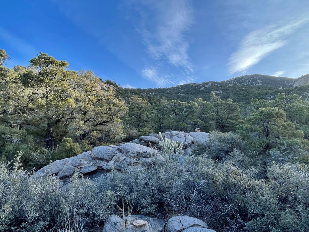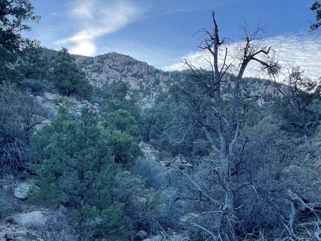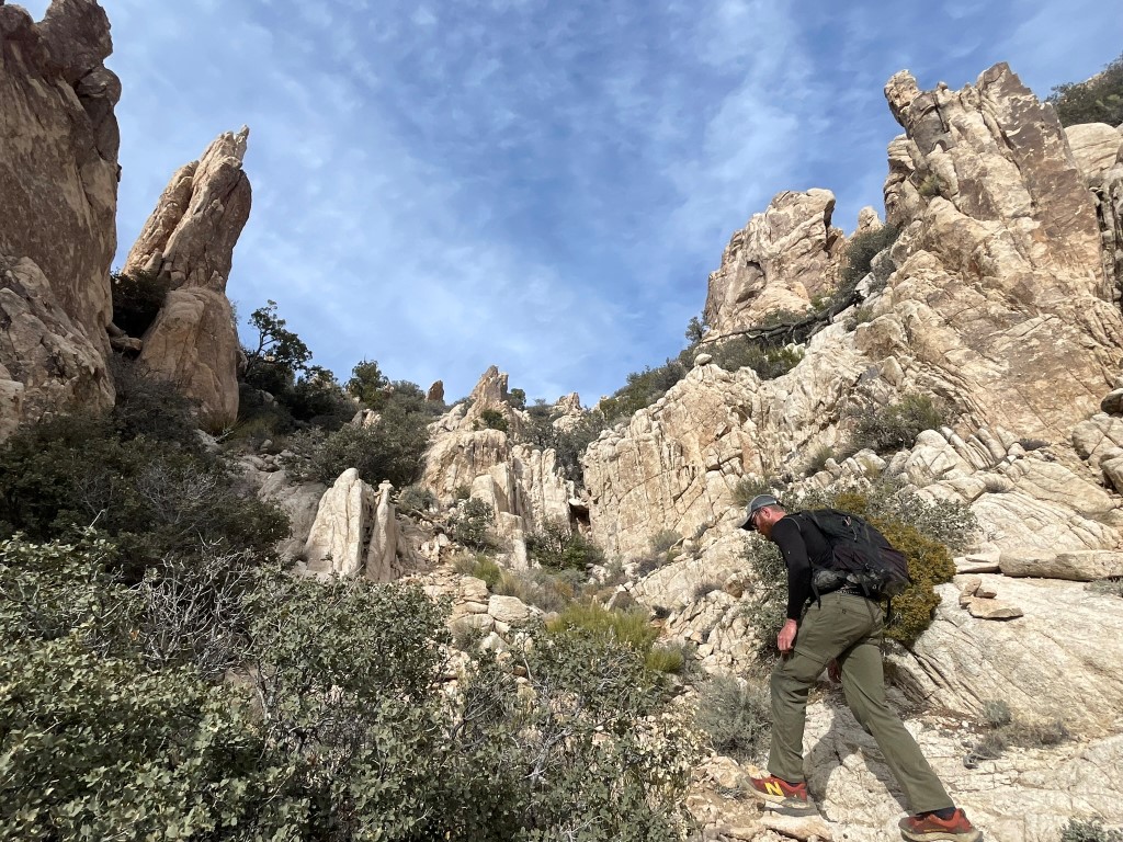 The wash was very brushy which slowed us down. We were surprised to find some tiny snow patches even below 5000 feet.
