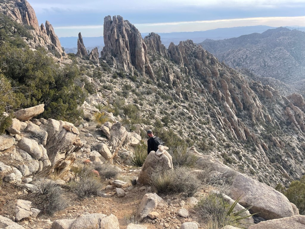 The wash petered out and we climbed up a steep slope to the main ridge, which we reached at 2.8 miles / 5700 feet.