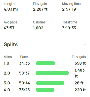 We reached the cars at 4:49pm. Stats for this hike were 4.03 miles, 2287 feet elevation gain, and 3:19:33 total time.