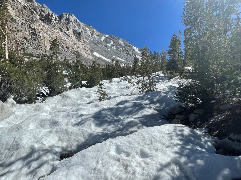 The trail was intermittently covered in large snow patches beyond Anvil Camp.