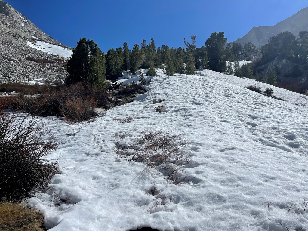 There was one guy who already had a tent set up. He was planning to climb Williamson the next day. We chatted briefly and then I continued. Ken stayed behind for a little while to grab some water from the creek. I crossed Shepherd Creek and then left the camp heading west.