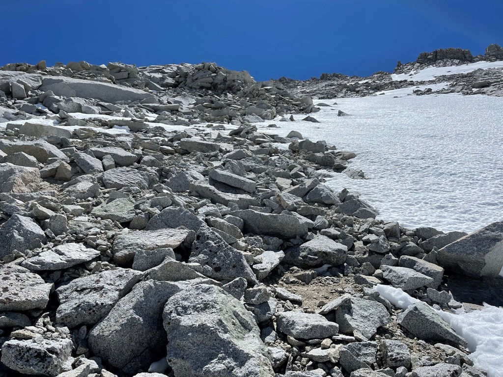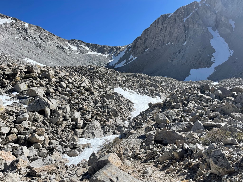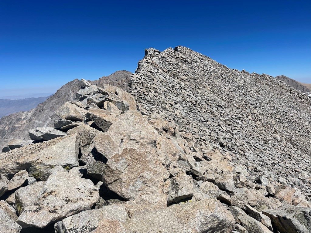 I climbed out of the bowl and made my way to the base of Tyndall. I passed another hiker heading towards Williamson. She was concerned about having enough time to climb Williamson and get down to Anvil Camp before dark. I reached the base of Tyndall’s north rib at 5.9 miles as 12500 feet.