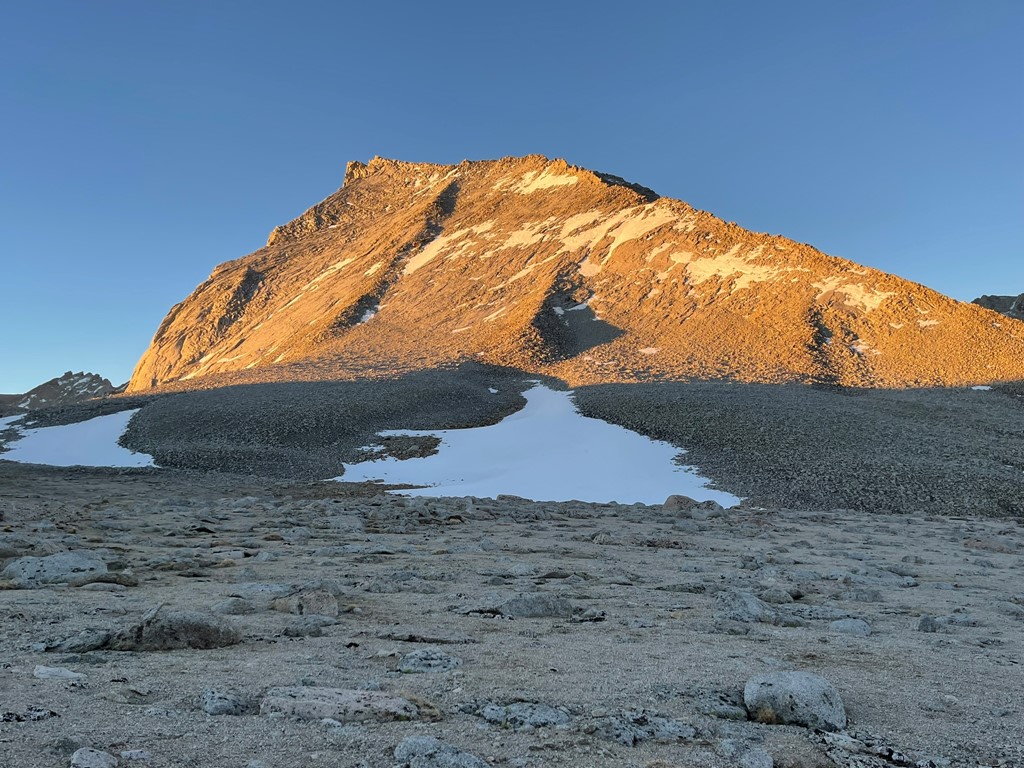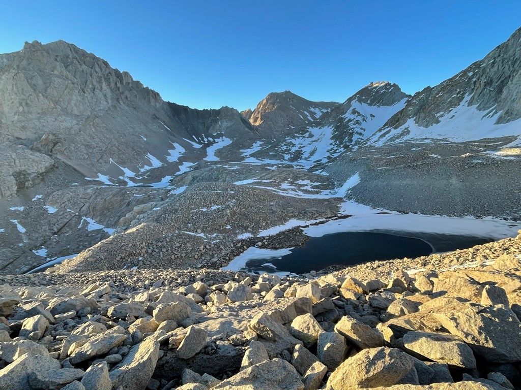 I woke up with the sunrise around 5am, and I was ready to start hiking around 5:30am. Ken, who I had hiked with a few miles the day before, had camped on the opposite side of the same lake. 2 other hikers (Marco and Tim) who I had seen the day before made it to the pass right as Ken and I were ready to go. They had started at 3am from Anvil Camp. Ken was heading for Tyndall and the rest of us were heading for Williamson. The 4 of us began hiking southeast, but Ken soon left the group to make his way up Tyndall. Tyndall was glowing in the early morning light.
