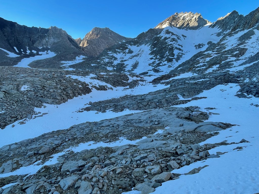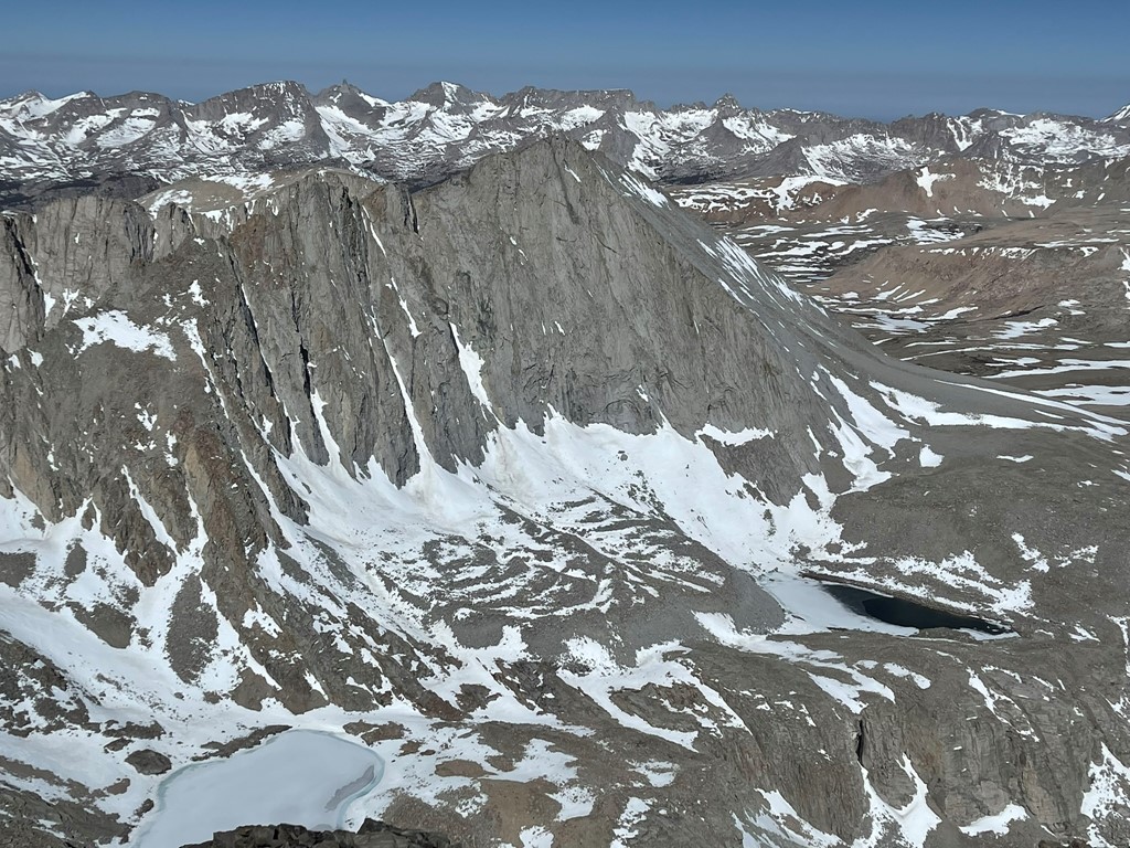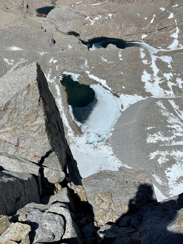 I also was able to spot my frozen lake at Shepherd Pass from above. My campsite was on one of the bare spots on the righthand shore.