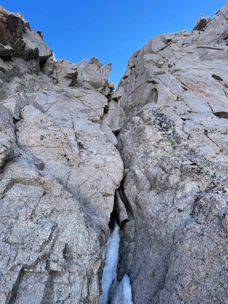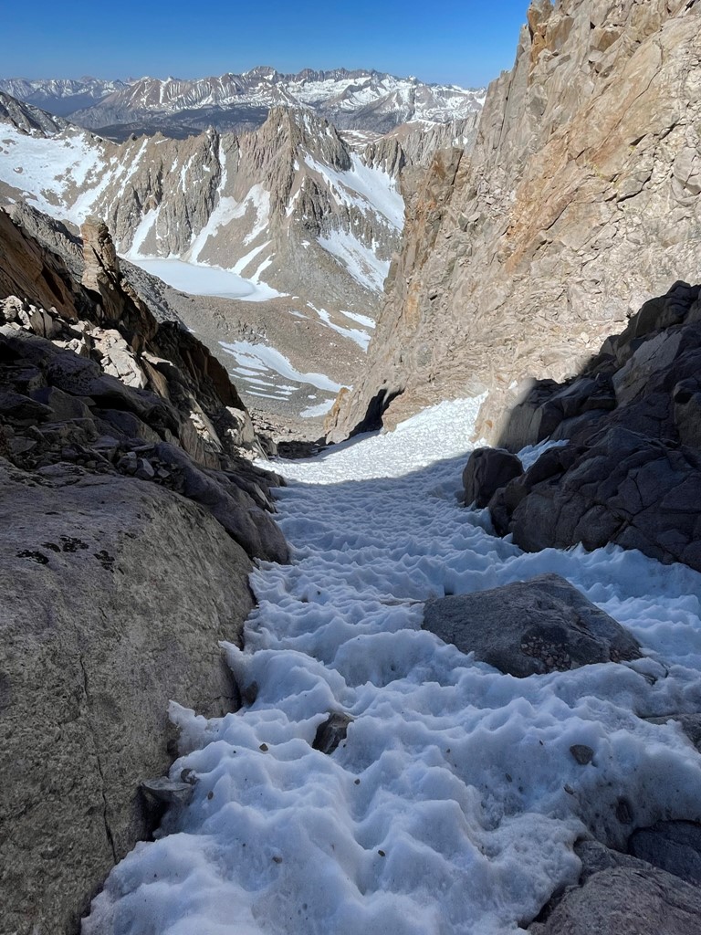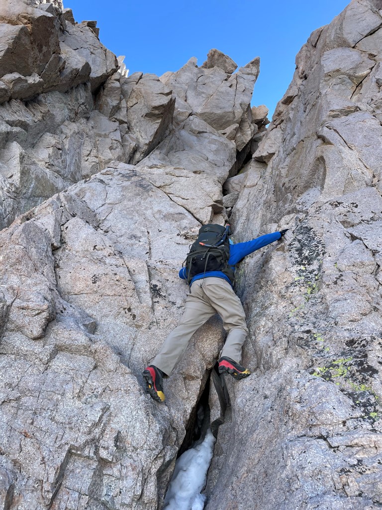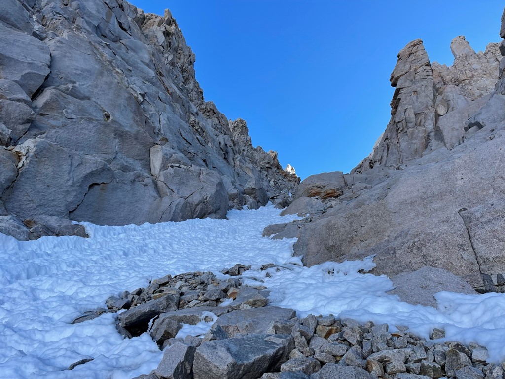 The rock in the chute was of better quality so we made decent progress. There were a few snow patches to climb up, but crampons were not needed.