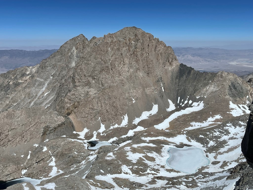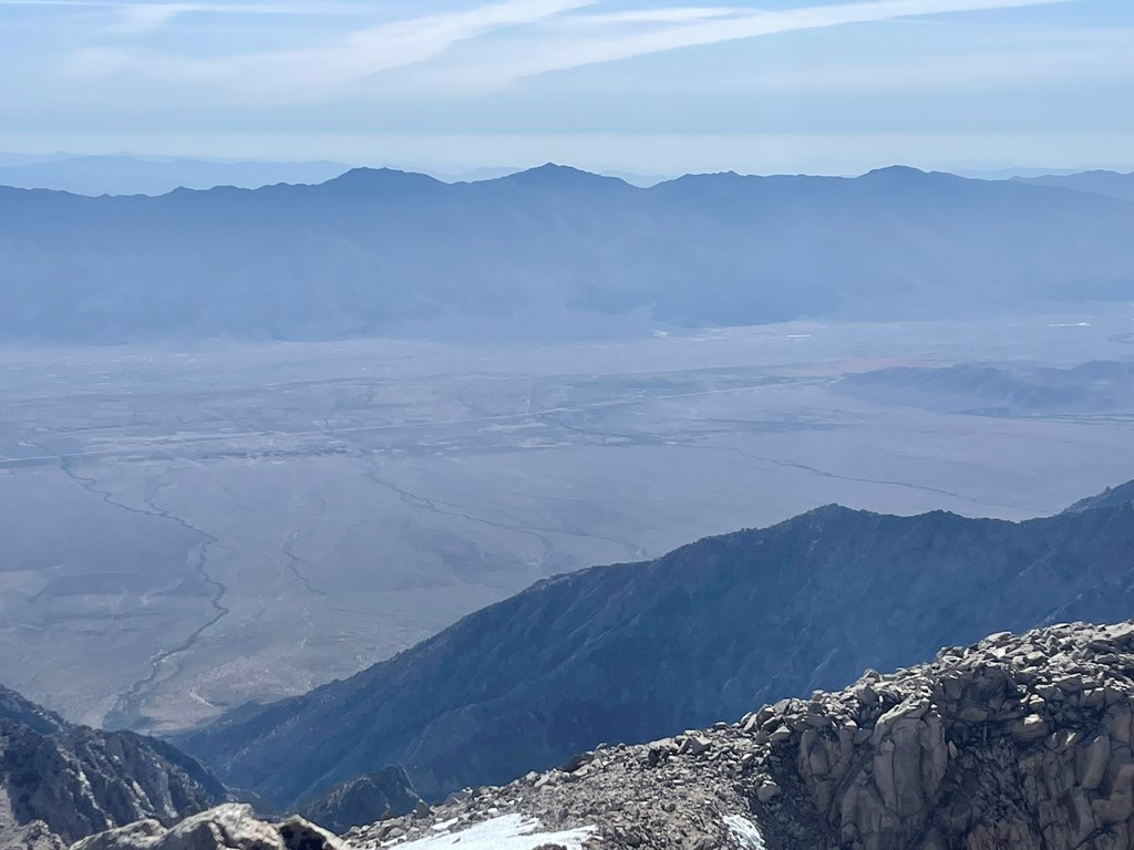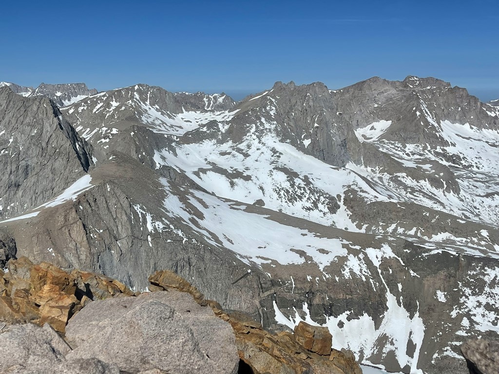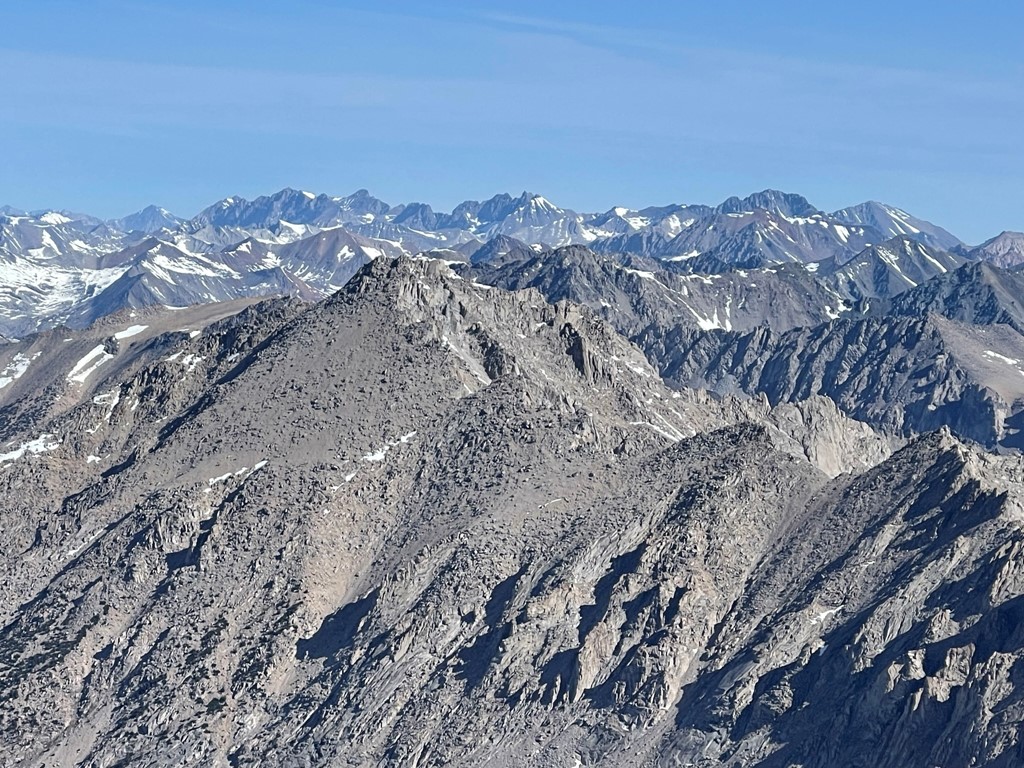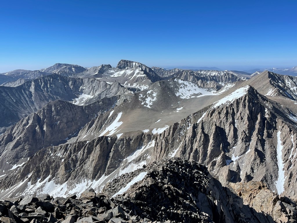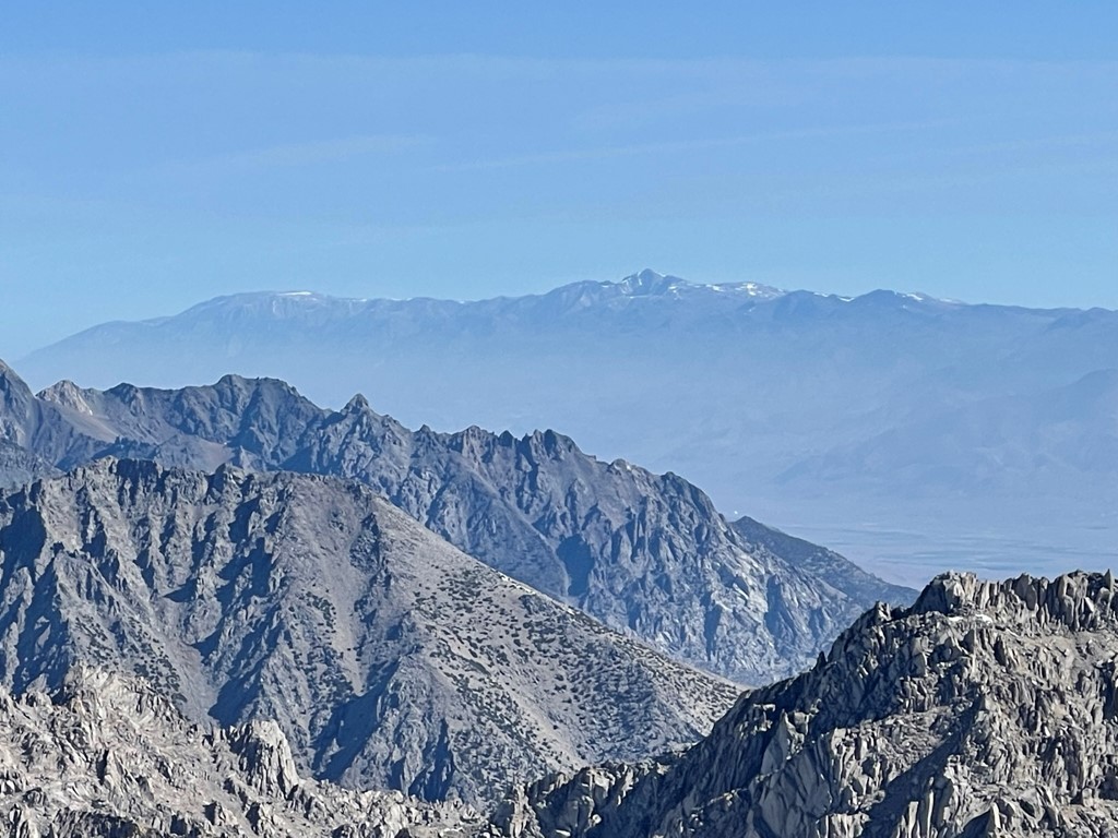 It was a pretty clear day, so the views were stunning. To the south were fellow 14ers Langley, Russell, and Whitney. Trojan Peak and Mount Barnard are on the far right.