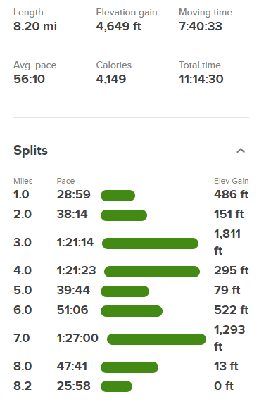 Stats for day 1 were 11.29 miles, 6424 feet elevation gain, and 8:08:53 total time.
