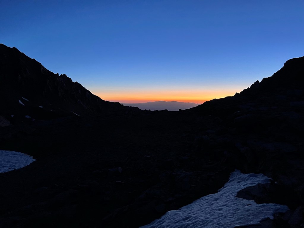 In order to get to the base of Mount Keith, I first needed to descend about 1000 feet down the Shepherd Pass Trail. Dawn was materializing in the east.