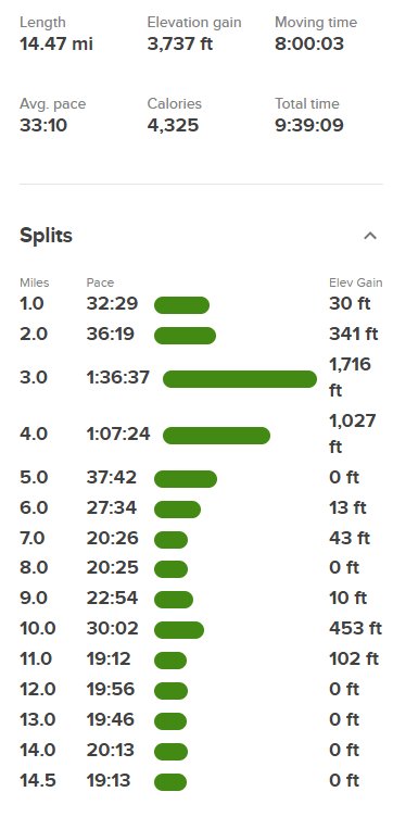 I reached the car at 2:39pm. Stats for day 3 were 14.47 miles, 3737 feet elevation gain, and 9:39:09 total time.