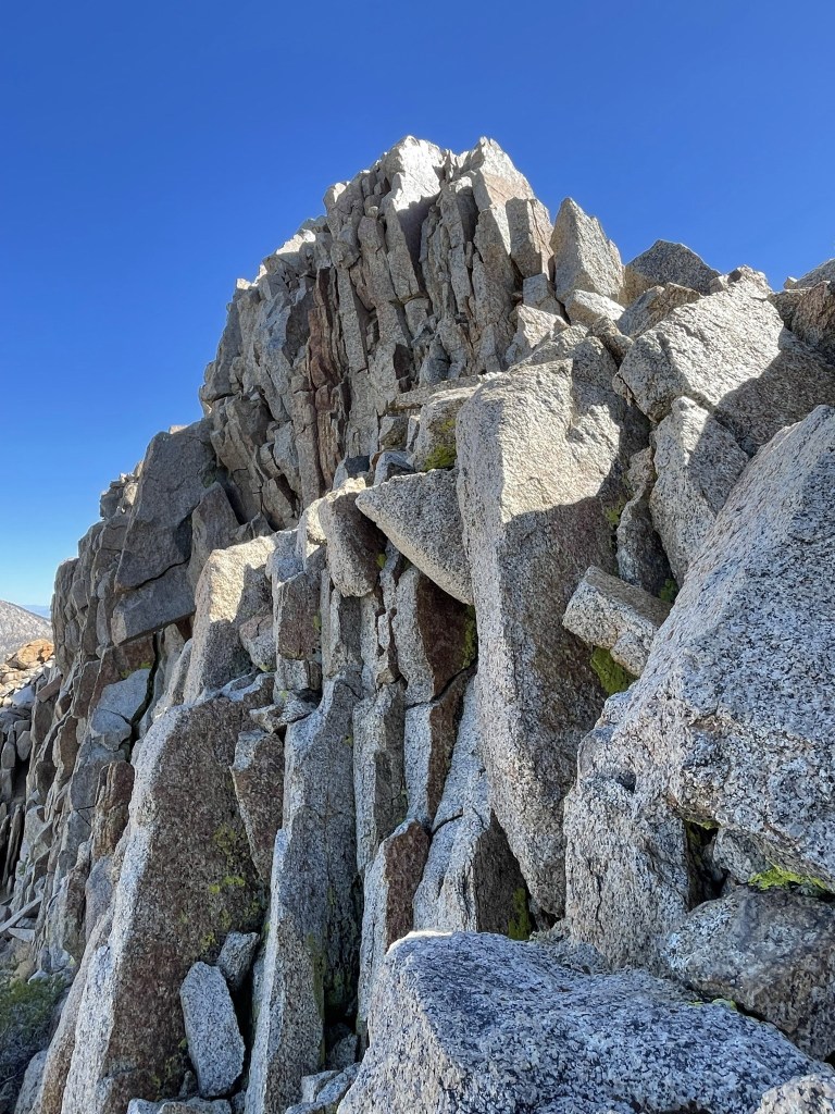 I also had a great view of the High Sierra to the north, but the views were much better on Trail Peak, so I took more pictures there. I began descending after a 25 minute break. I found it to be an easier scramble on the east side of the summit block.