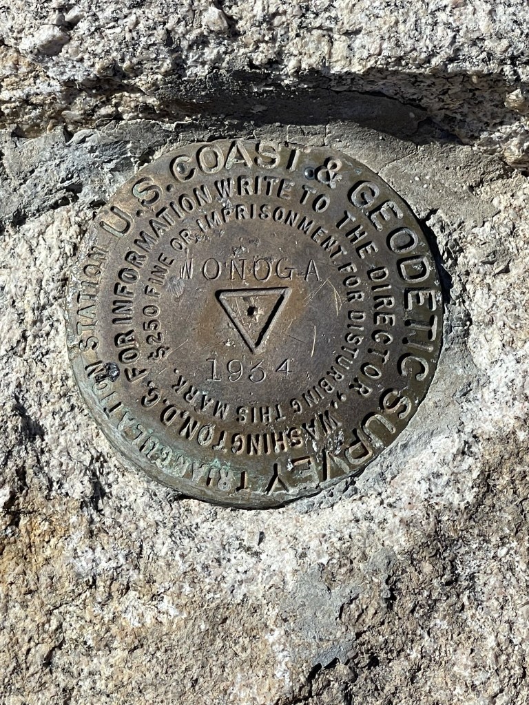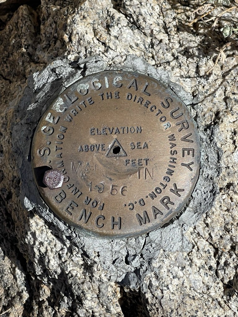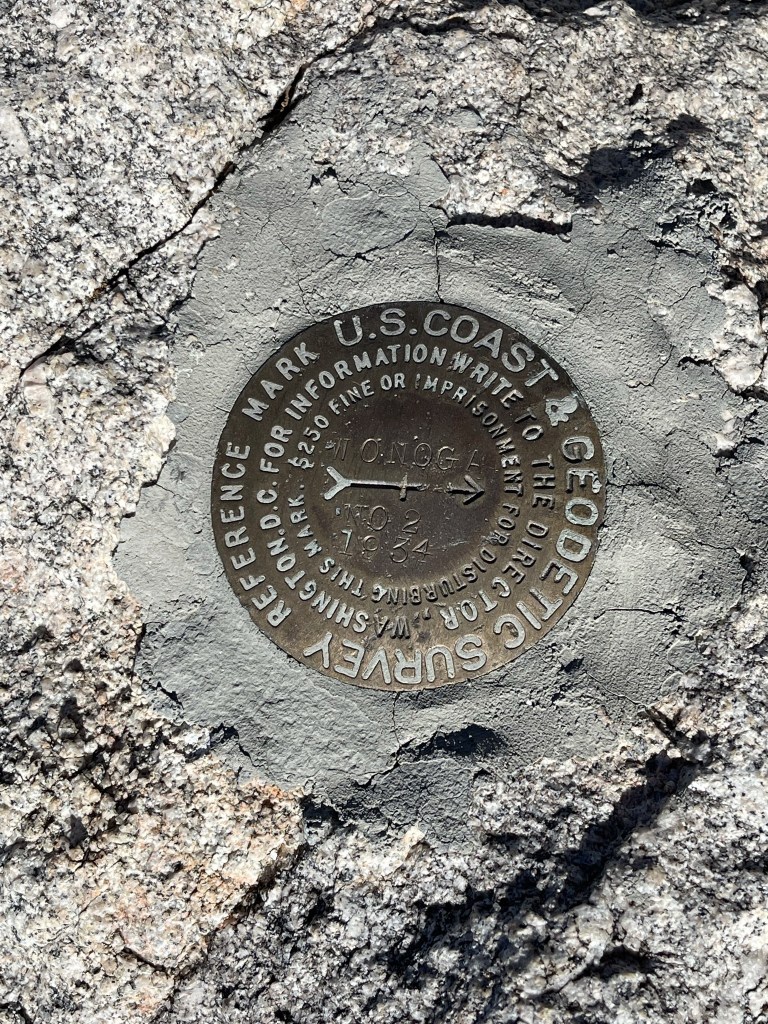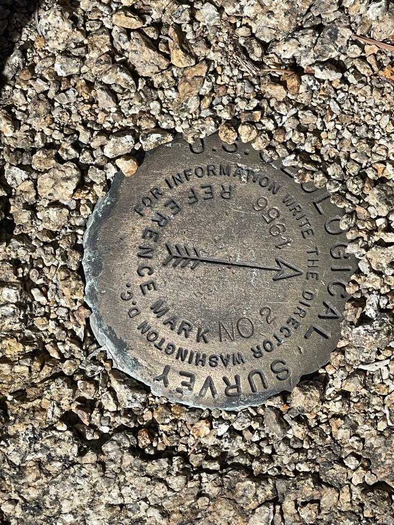 I reached the top at 1:23pm at 12.6 miles! I signed the register which had been placed in 2018. I was mildly surprised to find a bunch of entries from today. I guessed it was from one large group. I found a benchmark on the summit.