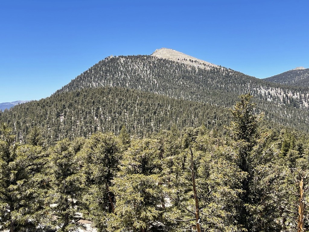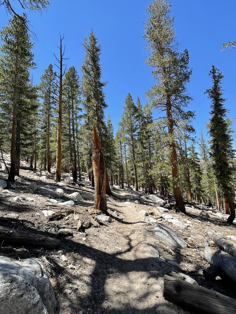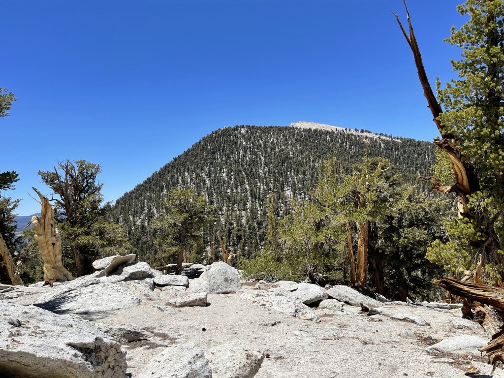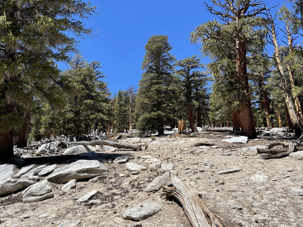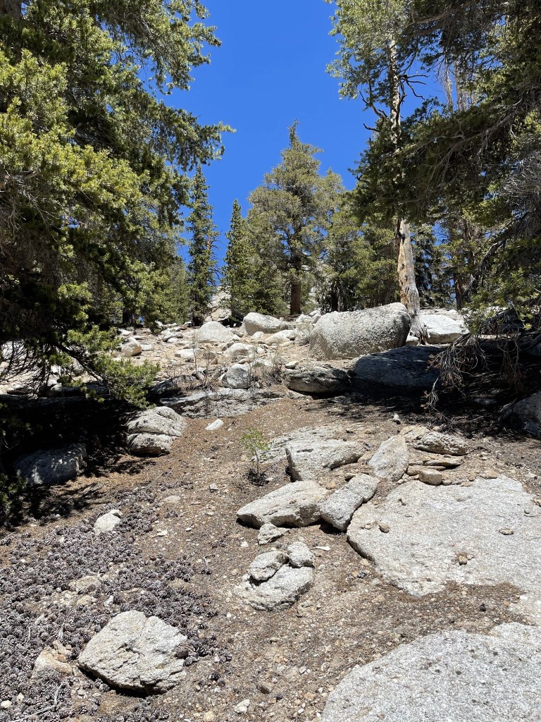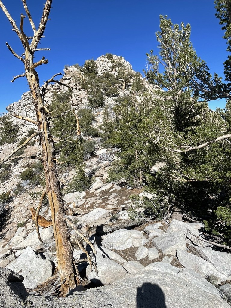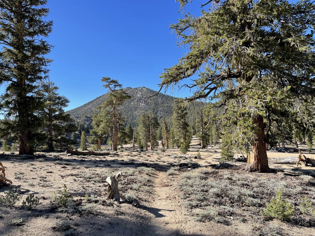 I hiked north on the PCT in the direction of Trail Peak. I didn’t see any more PCT hikers for the next few miles (not entirely surprising since I was now going in the same direction as them, but I thought I would still pass a few since they hike much slower with heavy packs). Just before reaching Mulkey Pass, I left the trail to make a short climb to an unnamed Peakbagger peak of elevation 10605. This peak is referred to as Mulkey Peak by some climbers on Peakbagger, which seems appropriate given how close it is to Mulkey Pass. I climbed north up a forested slope to the peak.