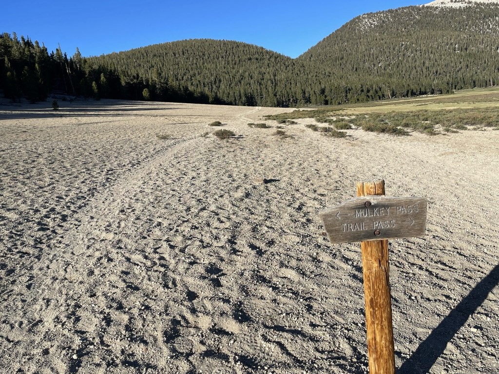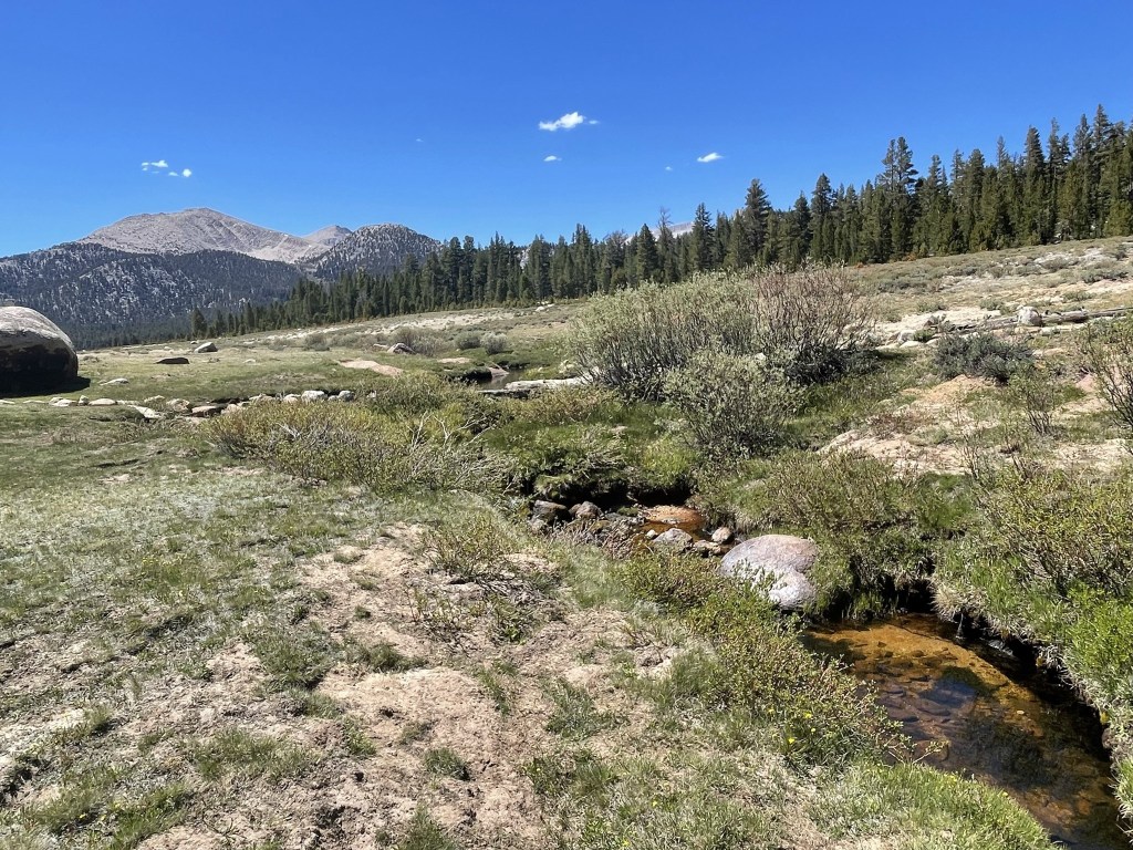 I proceeded across the meadow and reached the Mulkey Pass Trail on the far side. I had to cross another small creek just before reaching the trail.