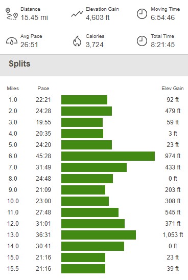 I turned east and soon reached the parking area. I made it to the car again at 3:08pm. This hike totaled 15.45 miles, 4603 feet elevation gain, and 8:21:45 total time.