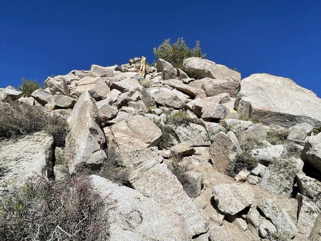 At 4.4 miles I reached the Wormhole Canyon Trail, which goes all the way down to the Owens Valley (according to the map). I turn left (east) onto this trail to approach Muah Mountain. A small cairn marked the turnoff.