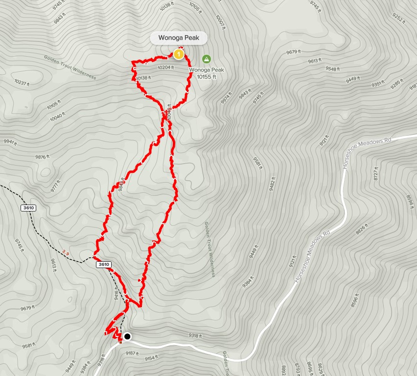 I had time for one more short hike, so I decided to climb nearby Wonoga Peak (10371 feet). I drove about 4 miles east on Horseshoe Meadow Road and parked at a large turnout where the Little Cottonwood Creek Trail begins. I began this hike at 3:33pm from 9254 feet.