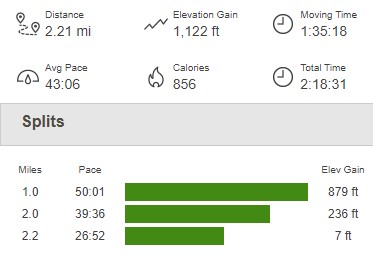 I reached the trail again at 1.9 miles. From there it was a short hike back to the car, which I reached at 5:51pm. This hike totaled 2.21 miles, 1122 feet elevation gain, and 2:18:31 total time.