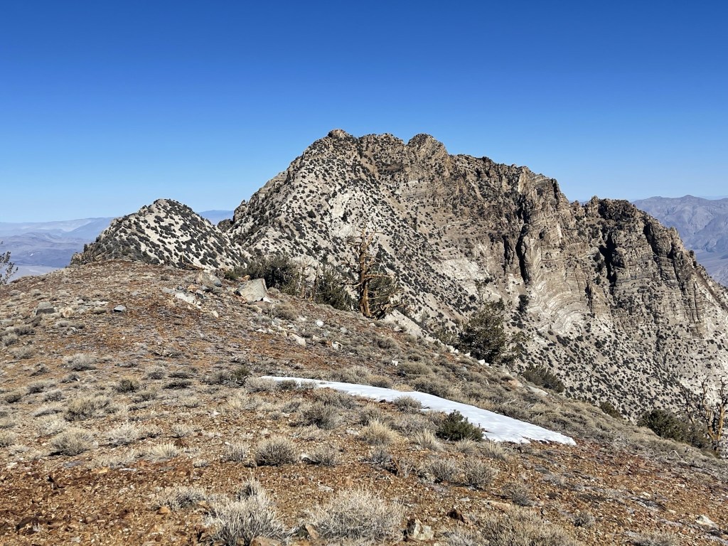 Despite not having a name, I decided the peak was a fun climb and a worthy addition to my hike. While not being on any well known lists, Peak 10327 is one of 61 non-Sierra peaks in California of at least 10000 feet (using the standard 300 foot prominence cutoff). The eastern side of the crest had much more snow than the western side. New York Butte is upper right: