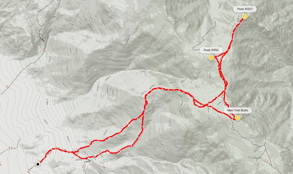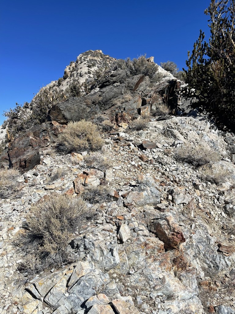 The final climb to Peak 10327 was along a narrow ridge that was steep and full of loose rock. I was getting very exhausted since my legs had over 7000 feet of elevation gain in them already.