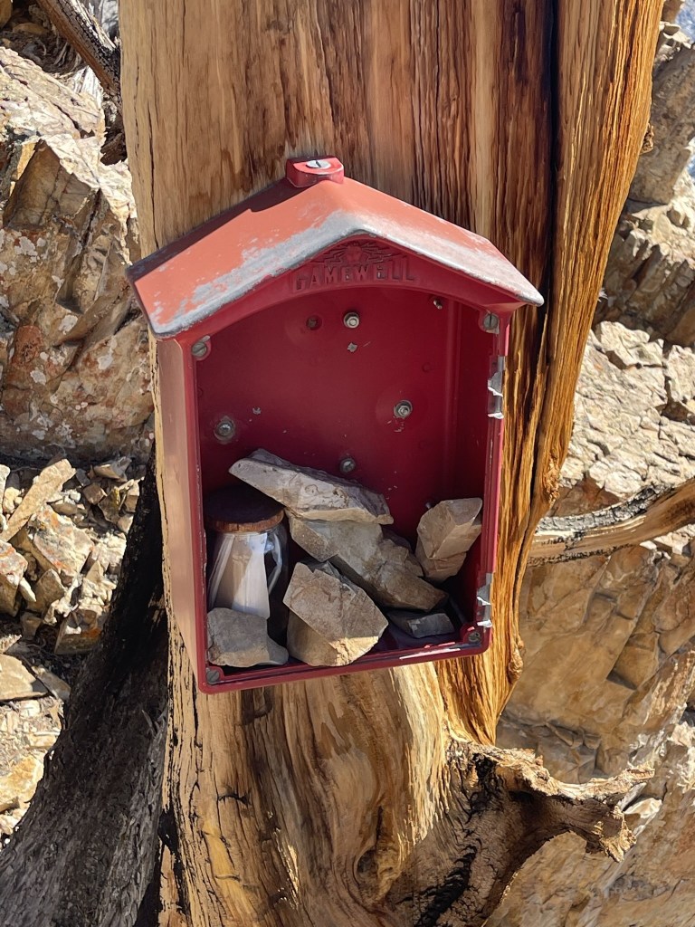 The register was located in this box just below the summit block. The register had been placed in 1981 and was previously signed on June 15. The register referred to the peak as “Survivor Peak.”