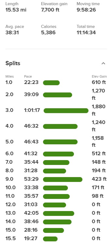 I reached the car at 5:16pm. Stats for this hike were 15.53 miles, 7700 feet elevation gain, and 11:14:34 total time.